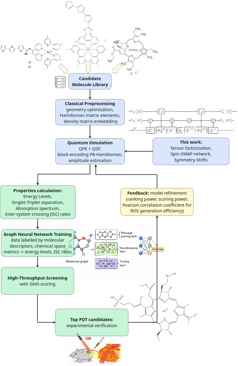Figure: High-level workflow of the hybrid quantum-classical pipeline for photodynamic therapy drug design. A fault-tolerant quantum algorithm computes key photophysical properties (singlet/triplet energies, spin-orbit couplings and intersystem crossing rates) for a selection of candidate molecules. These quantum-derived results then train a graph neural network model, which can rapidly predict properties for large libraries of new molecules. The GNN-guided screening identifies top candidates with desired absorption and ROS-generating characteristics. Subsequent experimental feedback helps establish key metrics for quantum model refinement.