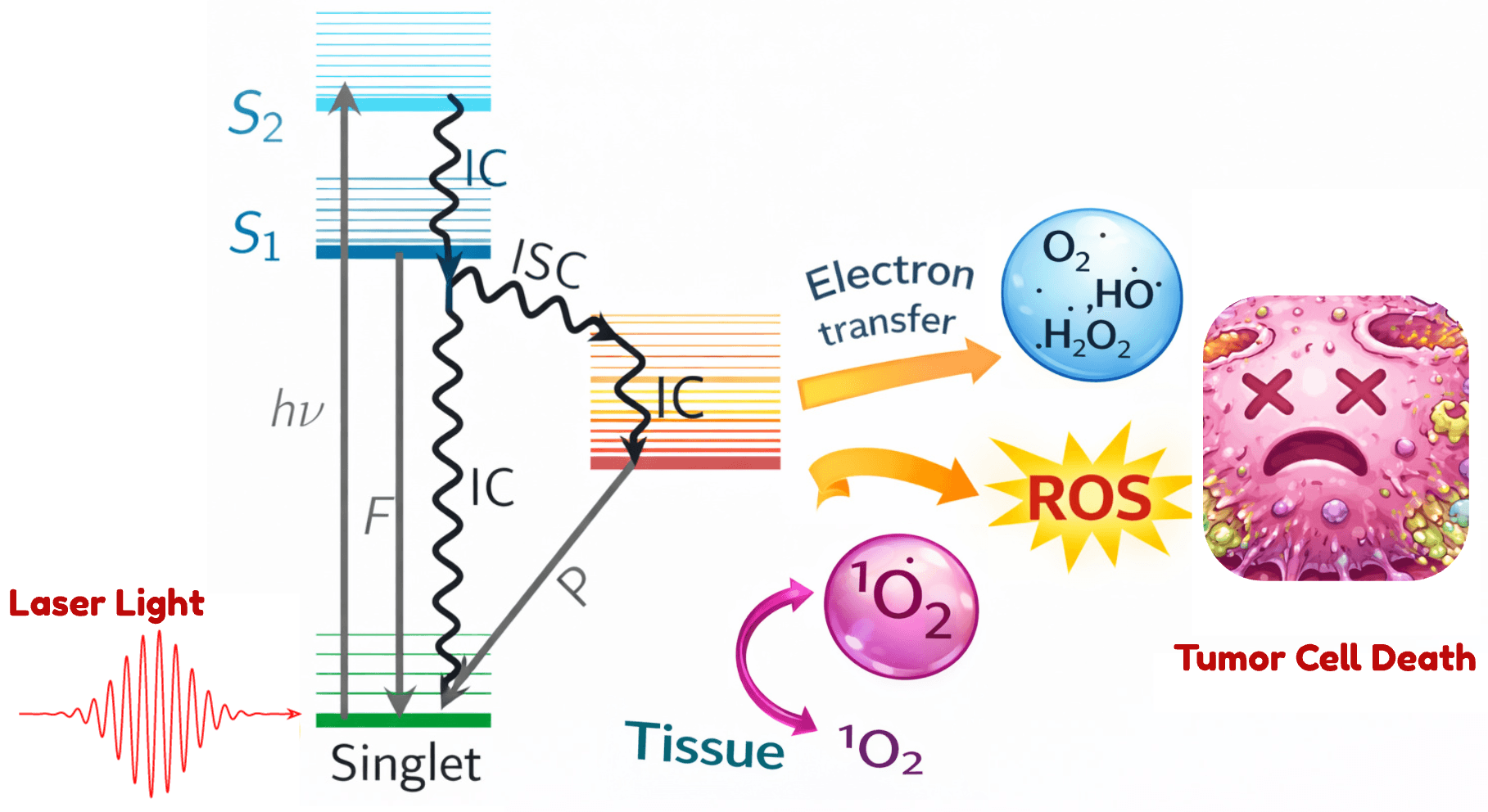 Figure: Schematic of intersystem crossing and ROS generation in photodynamic therapy. A photosensitizer molecule (left) is excited by a laser from its ground singlet state to excited singlet states (S₁, S₂). Throughintersystem crossing(ISC, wiggly arrow), the molecule transitions into a triplet state, which can then transfer energy to oxygen in tissue to producereactive oxygen species(ROS, e.g. singlet oxygen ¹O₂). These ROS go on to kill the tumor cell (right).